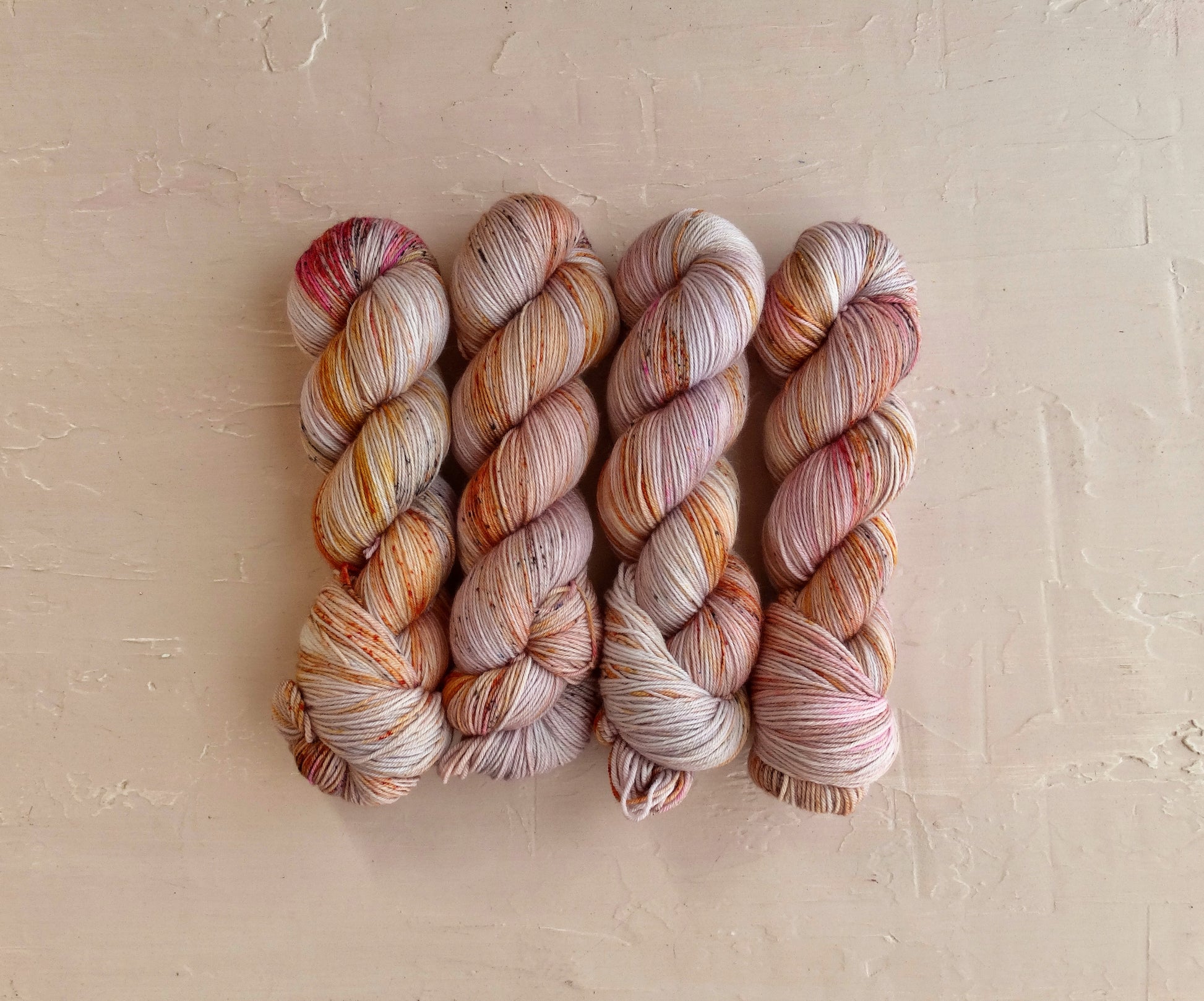 Las madejas de fibras teñidas a mano podrían tener ligeras variaciones por la naturaleza del proceso de teñido artesanal. Recomiendo comprar suficientes madejas del mismo lote para el mismo proyecto y si te gustan los tonos más uniformes puedes alternarlas de tanto en tanto.