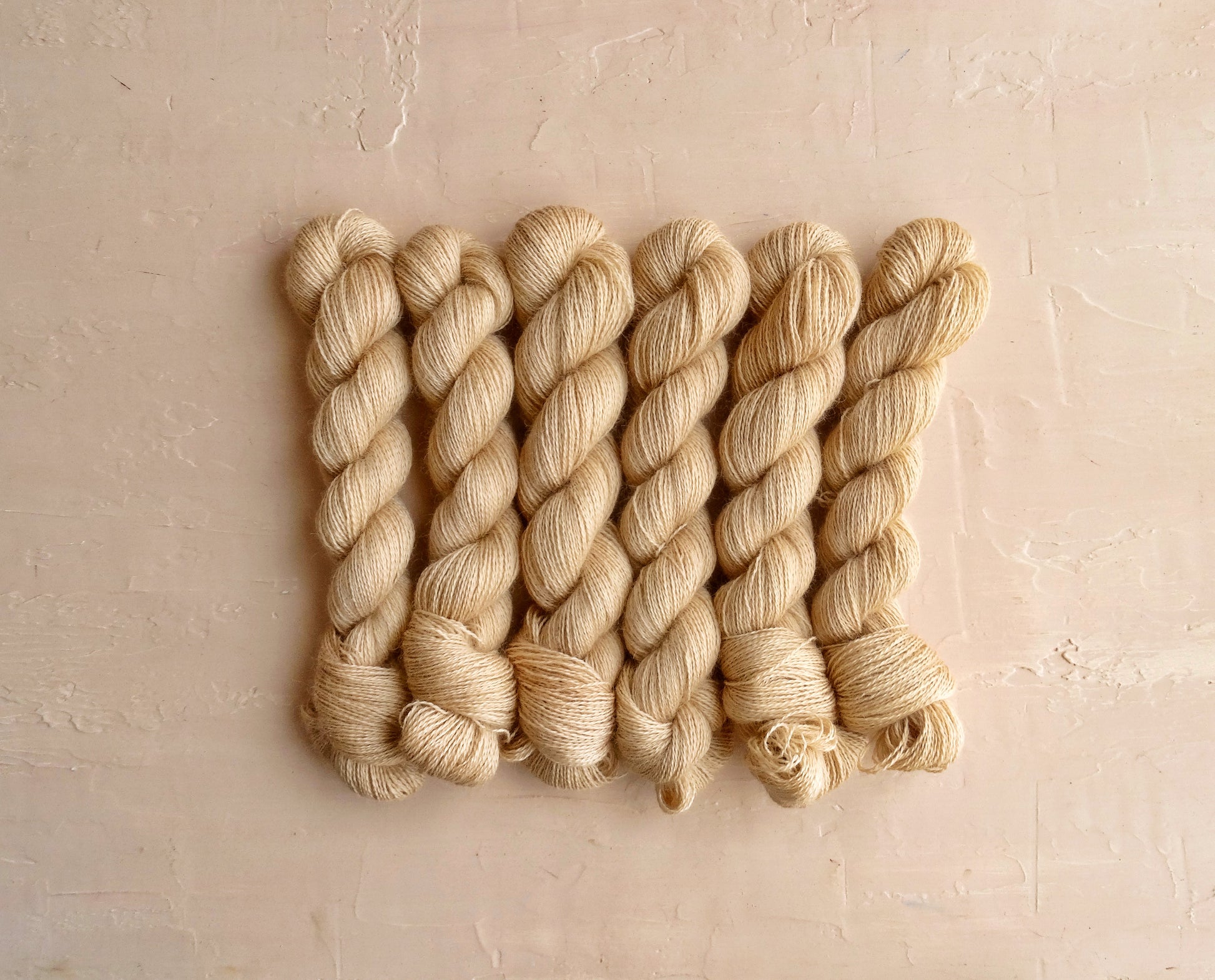 Teñida a mano en mi taller con una paleta suave y luminosa, cada madeja refleja la forma en que esta fibra única toma el color: con profundidad, vida y un brillo sutil que realza hasta los tonos más delicados.